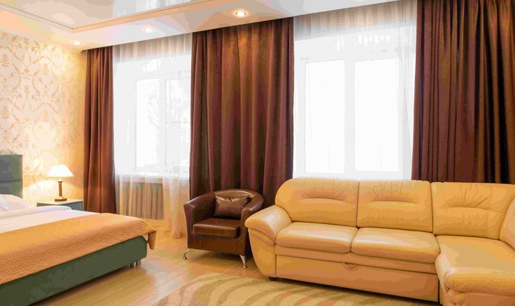 В номере: вешалка, диван раскладной, зеркало, кровать двуспальная, прикроватные тумбочки, стол, стулья, шкаф, телевизор, телефон, холодильник, чайный набор посуды, электрочайник